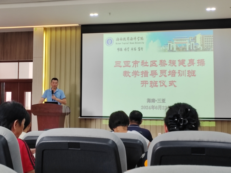 在开班仪式上,继续教育学院党支部李足书记作致辞讲话,他从推进三亚市全民健身高质量发展、践行高校服务社会的使命担当、推动全民健身与全民健康深度融合、提升三亚社区的知名度和影响力等方面强调了此次培训的重要意义,并希望参训学员珍惜此次学习交流的机会,加深对社区黎族健身操的了解,学好社区黎族健身操,成为一名社区黎族健身操教学指导员,当好一名科学健身的践行者、传播者和引领者。三亚市教育局职成科张光志作动员讲话,鼓励学员要认真学习、加强交流,并“以点带面”,充分发挥大家的示范引领带动作用,因地制宜、因时制宜、安全有序地组织开展贴近群众、方便参与、形式多样的全民健身活动,传播全民健身文化,推动三亚社区居民常态化开展体育健身运动,提升广大群众的生活品质和幸福指数。