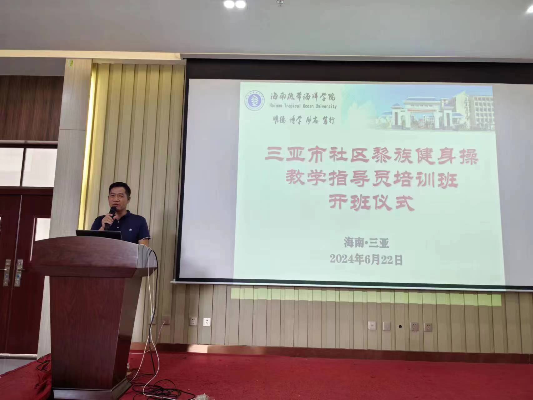 在开班仪式上,继续教育学院党支部李足书记作致辞讲话,他从推进三亚市全民健身高质量发展、践行高校服务社会的使命担当、推动全民健身与全民健康深度融合、提升三亚社区的知名度和影响力等方面强调了此次培训的重要意义,并希望参训学员珍惜此次学习交流的机会,加深对社区黎族健身操的了解,学好社区黎族健身操,成为一名社区黎族健身操教学指导员,当好一名科学健身的践行者、传播者和引领者。三亚市教育局职成科张光志作动员讲话,鼓励学员要认真学习、加强交流,并“以点带面”,充分发挥大家的示范引领带动作用,因地制宜、因时制宜、安全有序地组织开展贴近群众、方便参与、形式多样的全民健身活动,传播全民健身文化,推动三亚社区居民常态化开展体育健身运动,提升广大群众的生活品质和幸福指数。